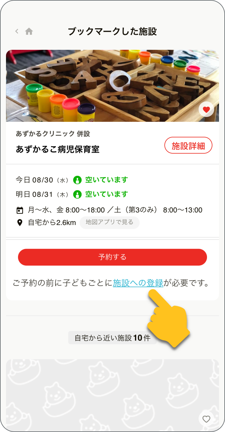 - 「施設をさがす」で「稲沢市病児・病後児保育施設」を選択し、「利用登録する」をタップ。